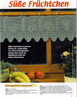 Короткая шторка для кухни с "фруктовым" рисунком вяжется поперек, поэтому можно связать "ленту" занавески нужной длины. Для полного комплекта используйте рисунок и на других вещах: край можно использовать для вязания каймы на полотенца, отдельные рисунки фруктов можно выполнить на салфетках.
